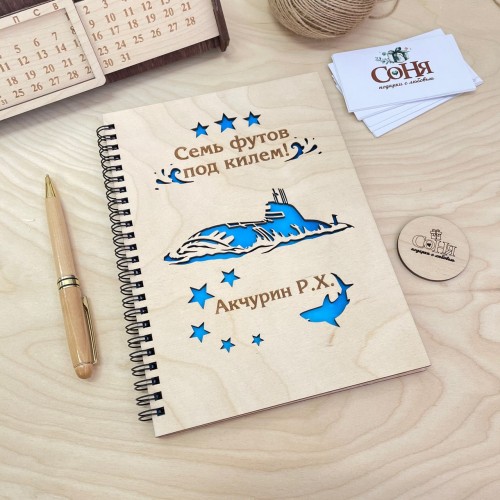 Блокнот на пружине с деревянной обложкой Подводная лодка