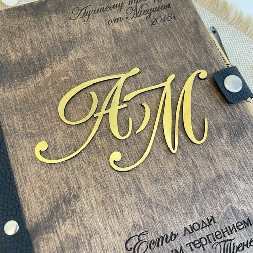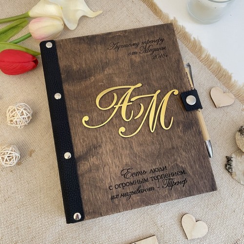 покрыта натуральным маслом для дерева. Переплет из качественной экокожи. В комплекте ручка с именной гравировкой
