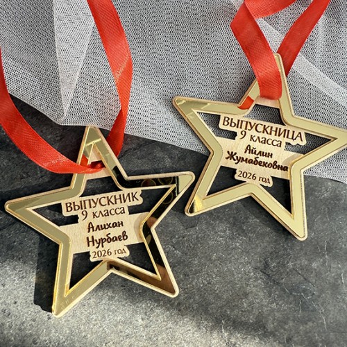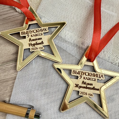 Именные медали - это простой и памятный сувенир для школьников и выпускников детского сада. Торжественное награждение запомнится каждому ребенку. Звезда двухслойная. Первый слой деревянный с гравировкой имени ребенка, второй стол золотой акрил.